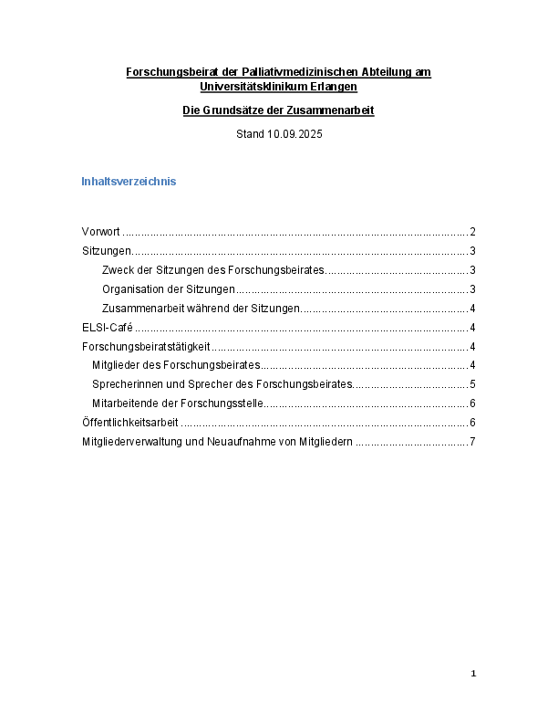 Forschungsbeirat der Palliativmedizinischen Abteilung am Universitätsklinikum Erlangen Die Grundsätze der Zusammenarbeit Stand 10.09.2025 Inhaltsverzeichnis Vorwort…