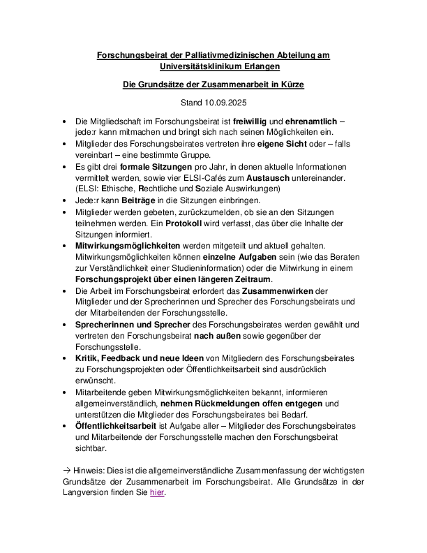 Forschungsbeirat der Palliativmedizinischen Abteilung am Universitätsklinikum Erlangen Die Grundsätze der Zusammenarbeit in Kürze Stand 10.09.2025 • • • • • • • • • • • Die Mitgliedschaft im…